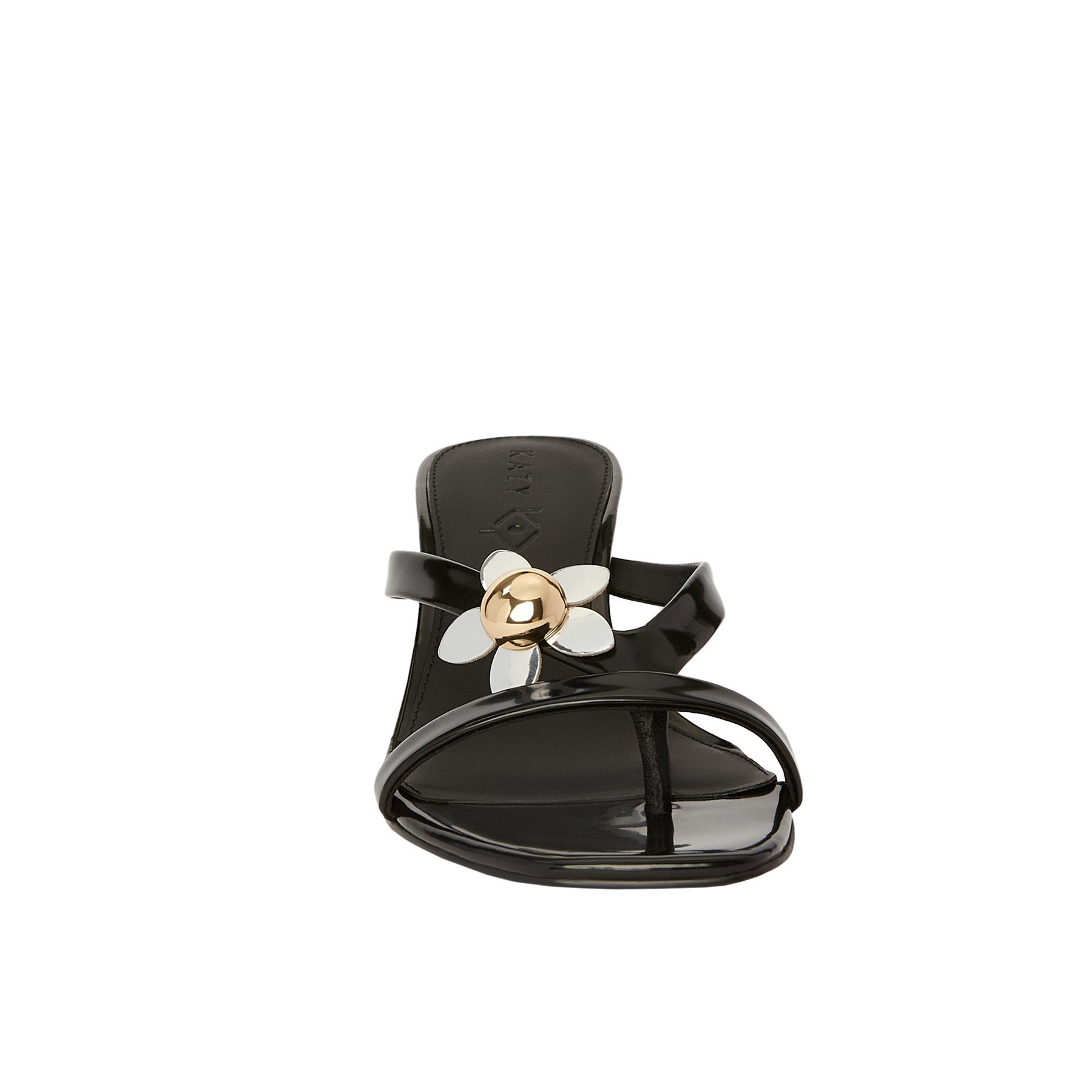 The Oceanside Flower Thong Sandal in Softy Box by Katy Perry combines a sculpted mid-heel with elegant thong strap detailing and a delicate metallic flower ornament, perfect for adding a touch of charm to any look.